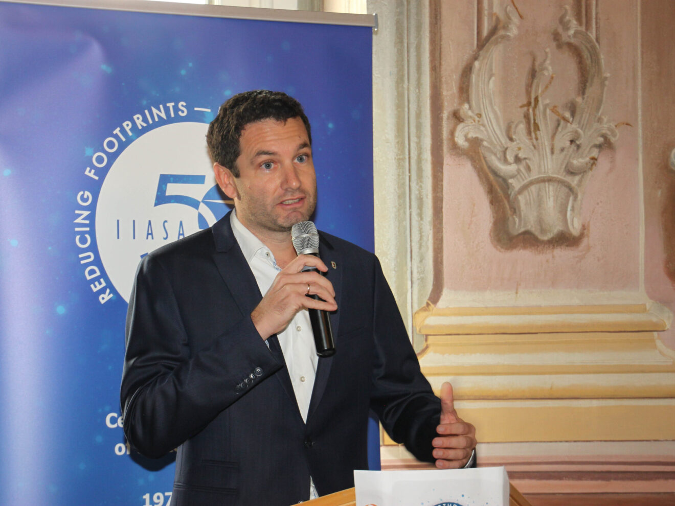 „Es ist uns eine enorme Freude, Sie alle hier bei uns schon so lange im Ort zu haben“, führte deshalb Bürgermeister David Berl gleich zu Beginn seiner Rede auf Englisch aus und erzählte von Sommern, die durch die Student*innen des IIASA im Ort immer besonders lebendig würden, vom Miteinander, das seit Jahrzehnten die Arbeit am Schlossplatz prägen würde und von der Öffnung in den letzten Jahren, die die wichtige Forschungsarbeit auch für viele Laxenburgerinnen und Laxenburger greifbarer und verständlicher gemacht hätte.