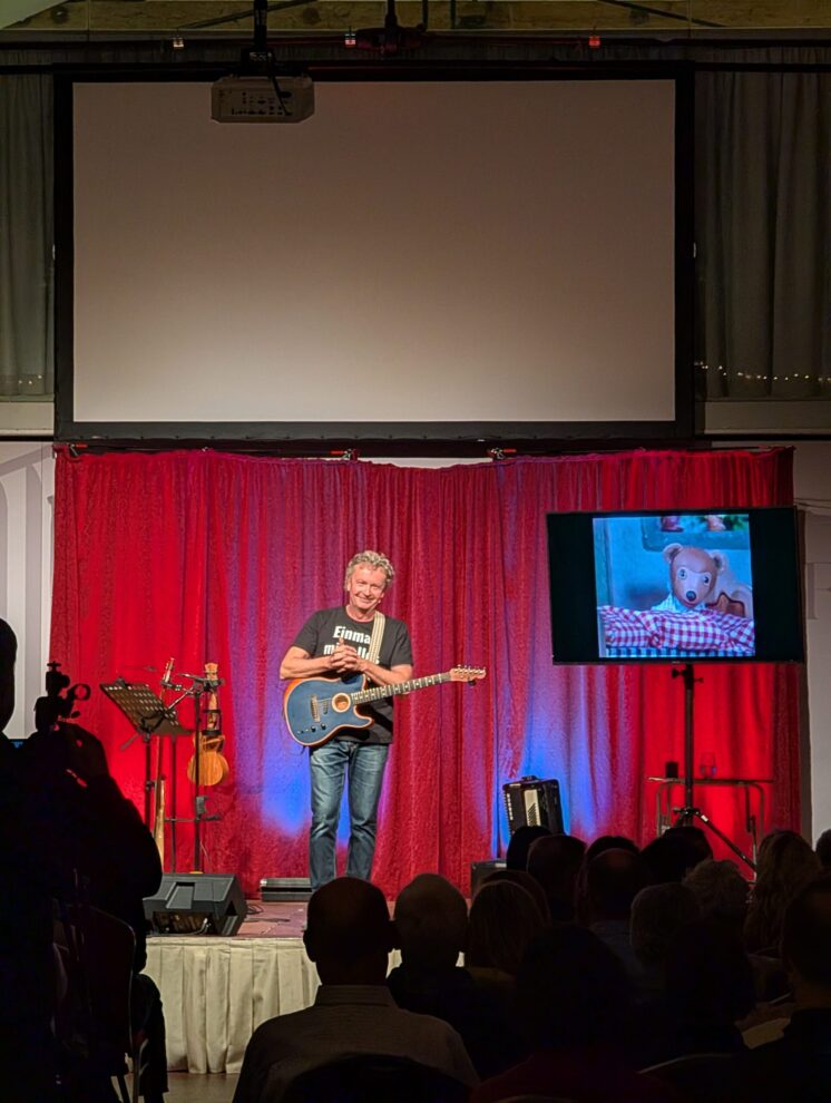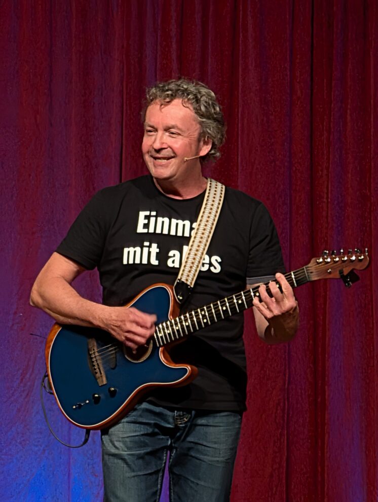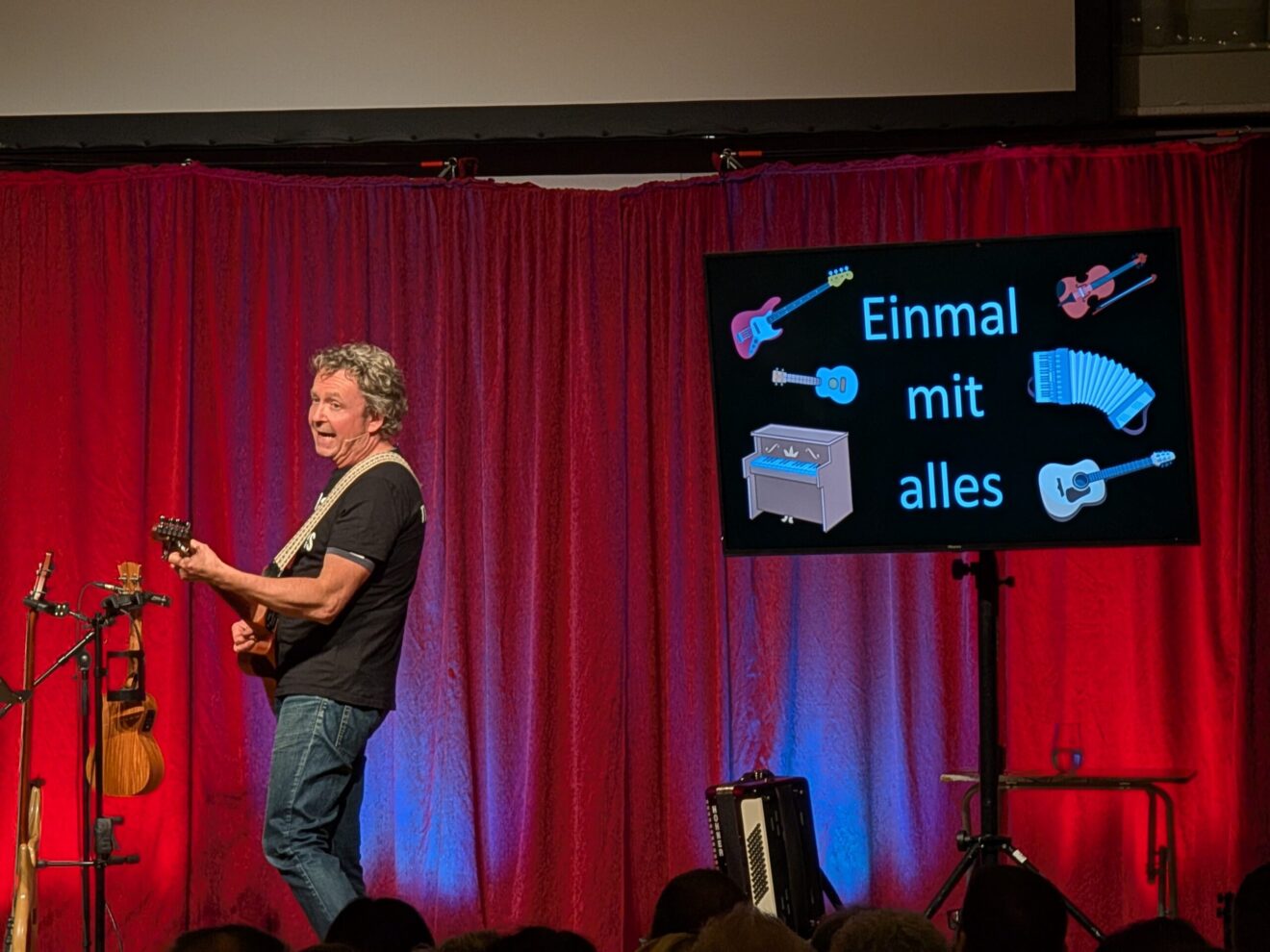 Natürlich, wenn man vor Ort nicht nur wohnt, sondern tatsächlich lebt, ist an so einem Abend das Publikum voller Menschen, die man kennt. Eine kurze Umfrage zu Beginn zeigte aber dennoch, dass auch einige Damen und Herren aus den Nachbargemeinden ihren Weg in den Veranstaltungssaal des Kaiserbahnhofs gefunden hatten und sich vom Vollblutmusiker Thomas Strobl genauso musikalisch an der Hand nehmen ließen, wie alle anderen. Und so wurde nach kurzem Seitenblick einfach mitgesungen und mitgelacht. Denn der Kabarettist zog einen großen Bogen von alten Fernsehsendungen und Werbungen bis hin zu unserer heutigen Lebensrealität. Sich an diesem Abend berieseln lassen? Fehlanzeige. Denn ein Monitor für textschwache Momente schuf Abhilfe, wo die Erinnerung nicht oder nicht mehr standhielt. Denn wer kennt tatsächlich noch alle Barbapapas oder den Text der Waschmittelwerbung mit den Faserschmeichlern?